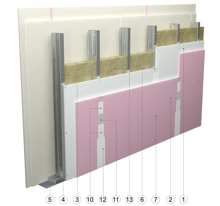 na konstrukcji z profili CW 100 i UW 100 w rozstawie co 400 mm, hybrydowy z dwukrotnym poszyciem płytami GKB typu A o grub. 12,5 mm i GKF typu DF o grub. 12,5 mm, z opcjonalnym wypełnieniem wełną mineralną