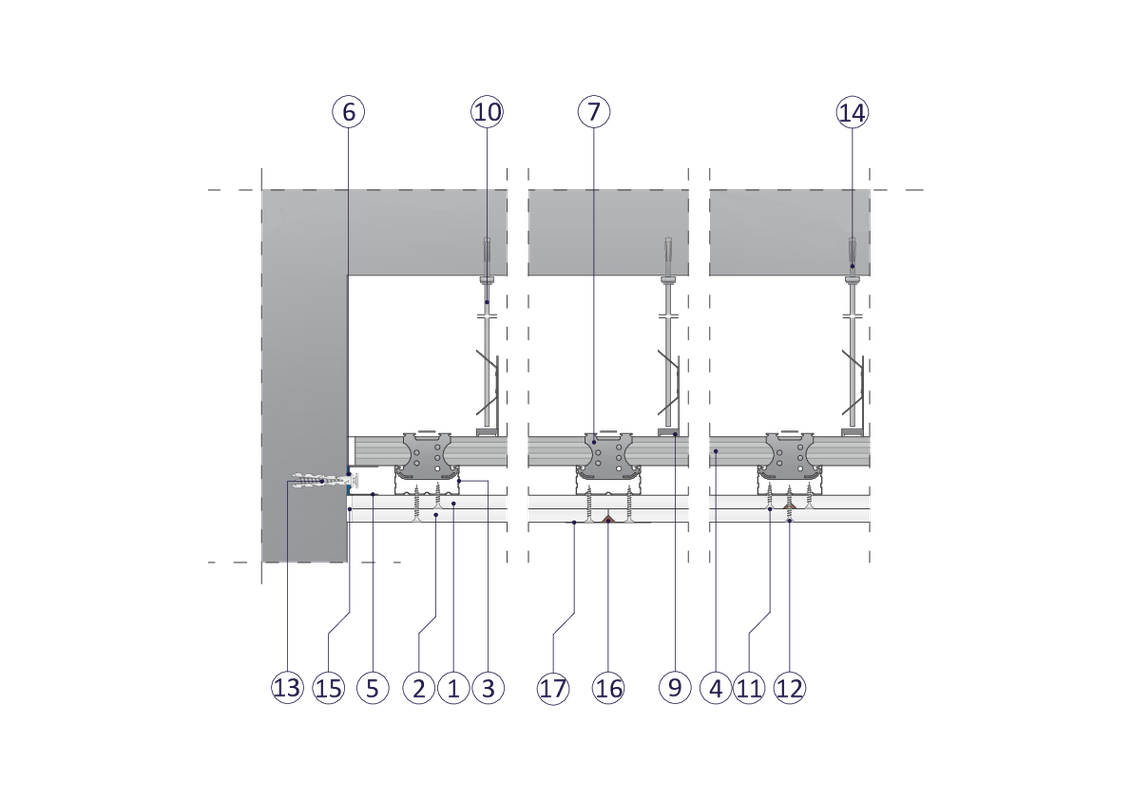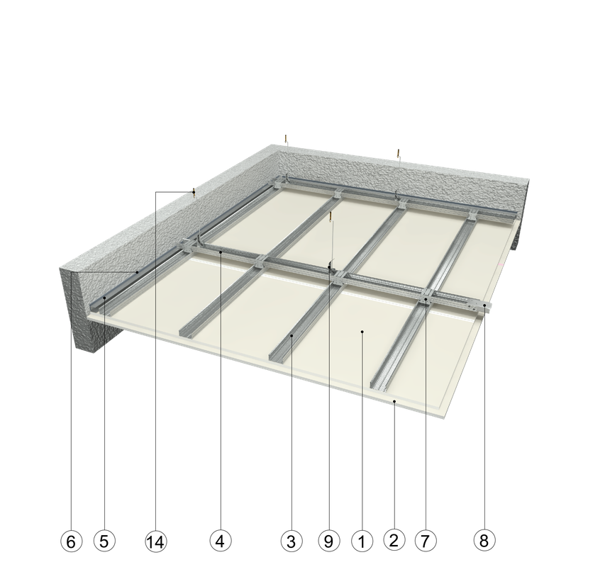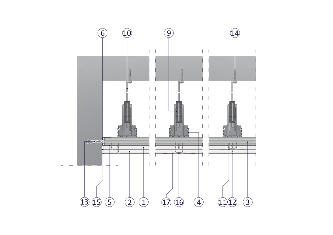 na ruszcie dwupoziomowym z profili CD 60 zamocowanym na wieszakach obrotowych ze sprężyną, hybrydowa z dwukrotnym poszyciem płytami GKB typu A o grub. 12,5 mm i typu DF o grub. 12,5 mm
