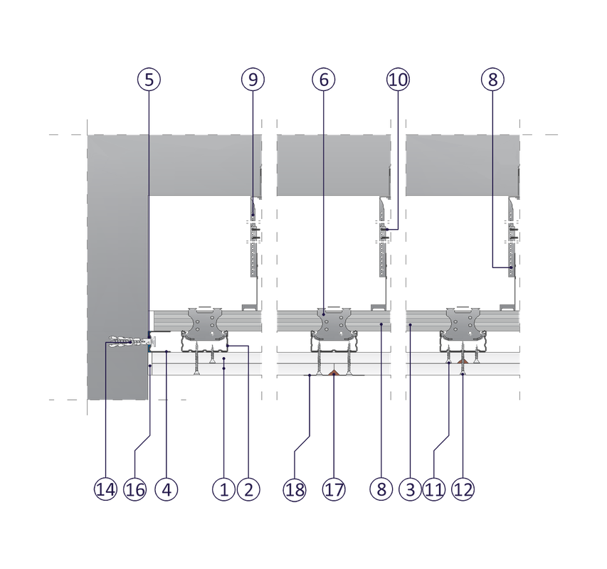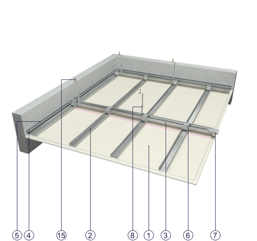 na ruszcie dwupoziomowym z profili CD 60 zamocowanym na wieszakach obrotowych z noniuszem z dwukrotnym poszyciem płytami GKF typu DF o grub. 15 mm