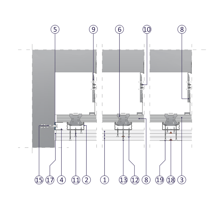 na ruszcie dwupoziomowym z profili CD 60 zamocowanym na wieszakach obrotowych z noniuszem z trzykrotnym poszyciem płytami GKF typu DF o grub. 12,5 mm