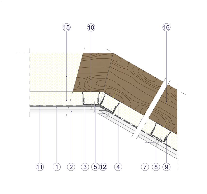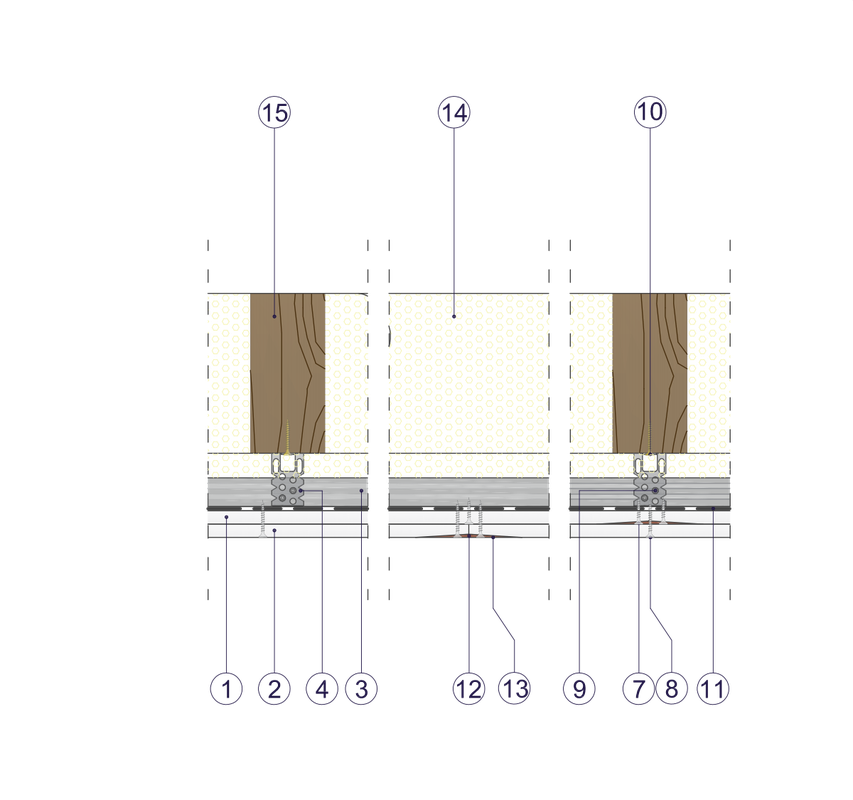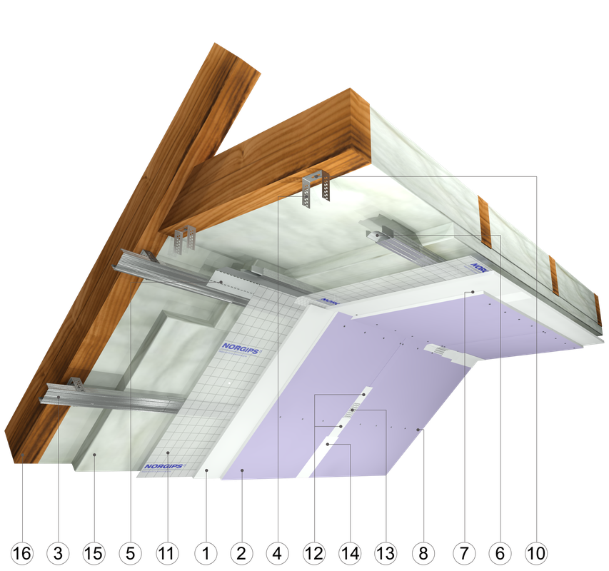 na konstrukcji z profili CD 60 i wieszaków ES/ES Plus, hybrydowy z dwukrotnym poszyciem płytami GKB typu A o grub. 12,5 mm i typu DFH2IRE o grub. 12,5